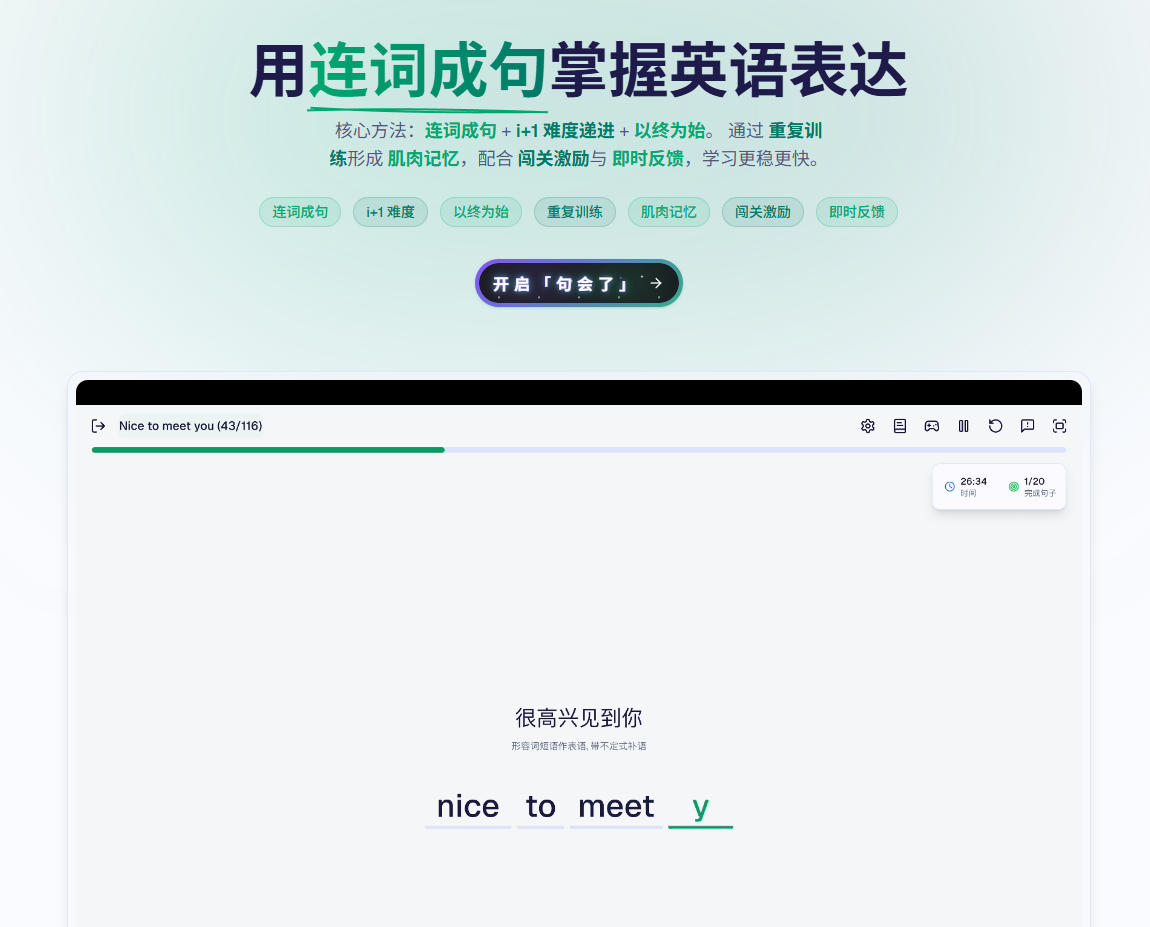 平台采用科学的学习方法、游戏化的设计和持续的反馈机制,配合引导模式、智能单词提示、实时纠错和渐进式难度,让学习过程像闯关游戏一样充满正向激励。用户可以通过排行榜、徽章等系统获得成就感,提升学习动力。